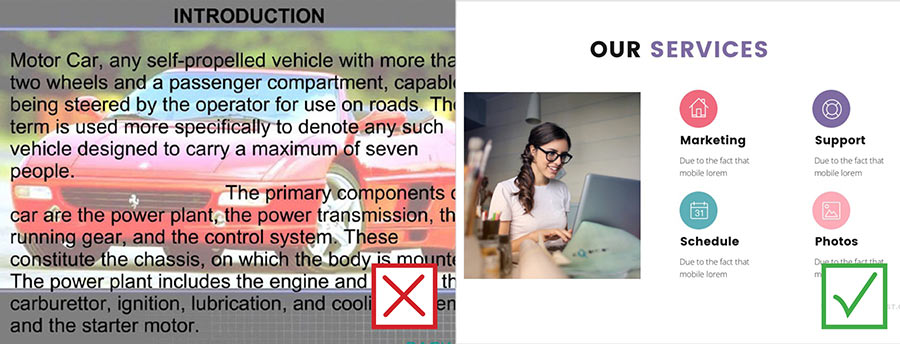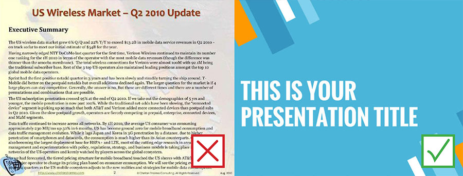 Preveč besedila bo uničilo še tako dobro predstavitev. In naj se sliši tako šokantno, na posameznem diapozitivu naj ne bo več kot ŠEST besed. Nobena predstavitev ni tako kompleksna, da bi morala to pravilo prelomiti. Zapomnite si namreč, da mora vaše občinstvo procesirati vse, kar je napisano na diapozitivu, medtem ko istočasno poslušajo še vas.