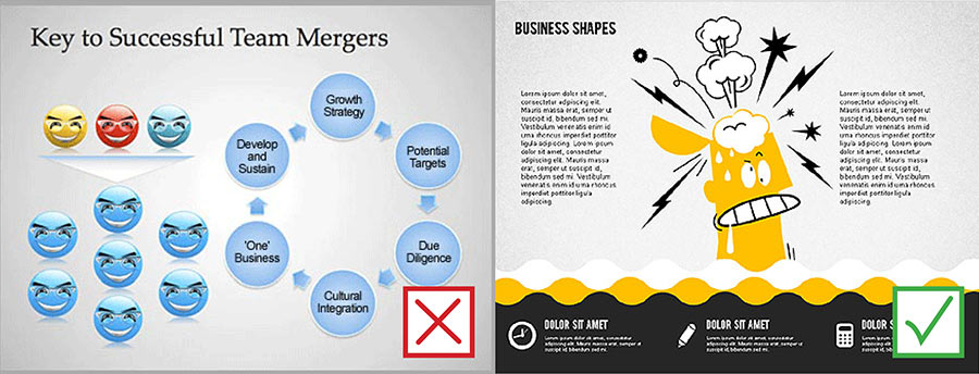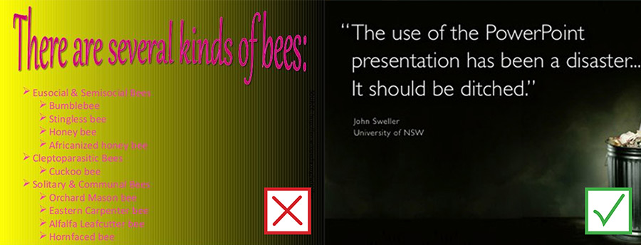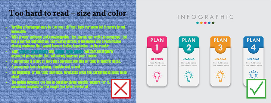 Prav tako smo pogosto priča predstavitvam, kjer so diapozitivi zapleteni, s preveč besedila, ki ga nikomur ne uspe prebrati med poslušanjem, vstavljene slike pa so neprimerno slabe kakovosti. Ogromna količina podatkov zmede tako poslušalca kot tudi predavatelja.