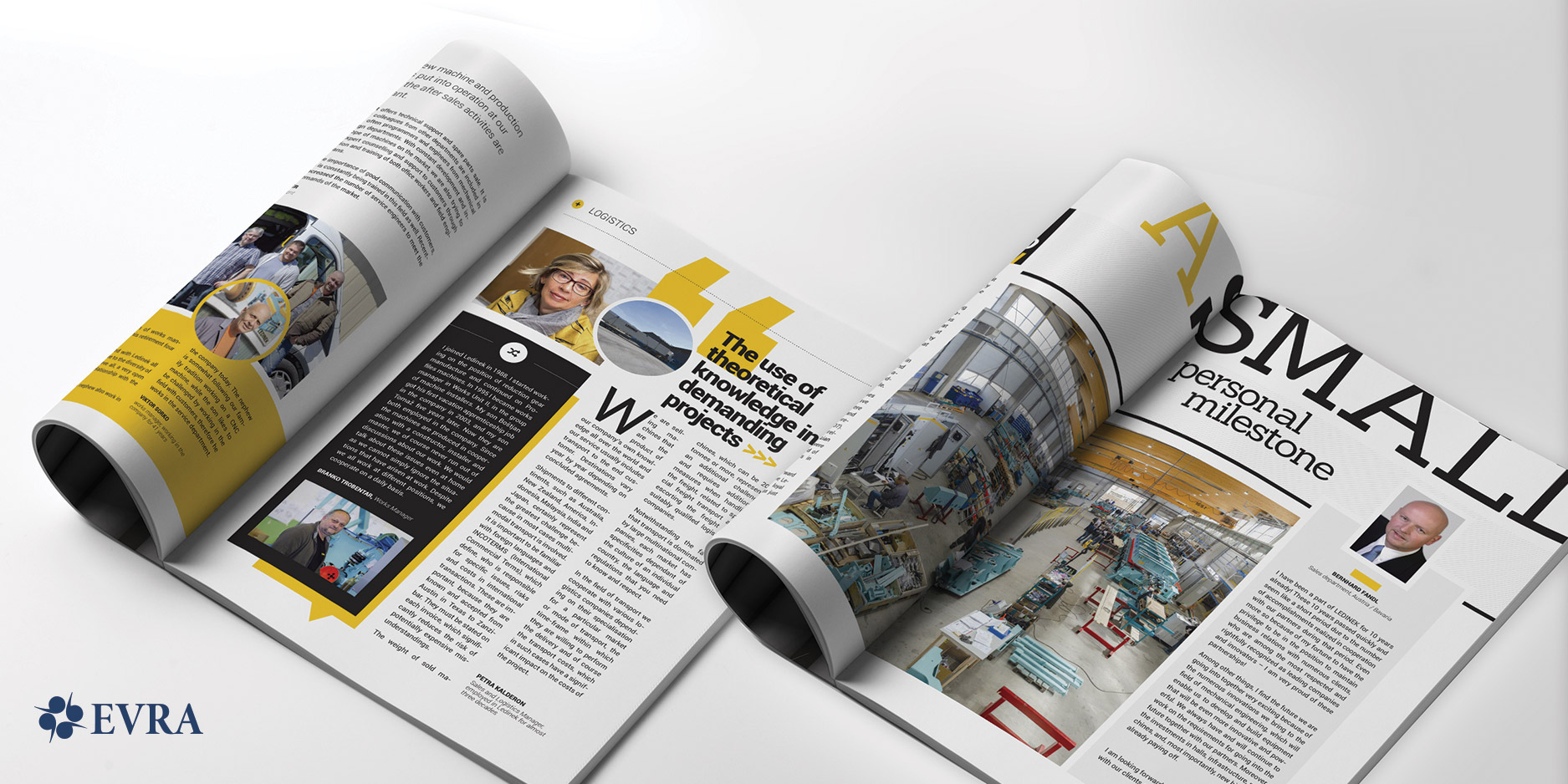 Vsebinsko smo publikacijo zastavili v angleškem jeziku in motivirali zaposlene, da so strokovni javnosti s področja pridelave lesa orisali nove tehnike, načine in prakse dela v njihovem podjetju. Z rumeno korporativno barvo, različno velikimi naslovi, okroglimi slikami.., smo skozi celotno tiskovino poizkušali doseči dinamičen in atraktiven izgled besedila, ki bi v nasprotnem primeru na prvi pogled delovalo suhoparno.